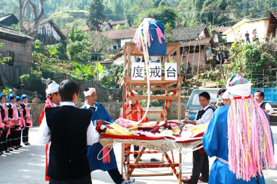 2014年12月15日,一行5人驱车来到绿春县牛孔乡娘六寨村,听说,今天村里要举行“度戒”仪式。上午9点半我们到该村时,见一瑶族民房内,一瑶族少年被大家簇拥着,祭师念着经书,场面有几分神秘、古朴。上午10点,“度戒”活动揭开帷幕,10余人鱼贯走出“度戒”者家门,在门口缓转3圈,到村场上又缓缓绕3圈,然后,走向“度戒”地。这支护送队伍中,由两对捧经书的人(师公)念诵经文领路,引教师和“度戒”者由一条腰带相连,在护送队伍之间,队尾由穿着绣有日月星辰和人物、龙的长青袍的道公扛着利剑断后。一路上锣鼓喧天,诵经不断,时而出现倾身扭腰、摆腿等一系列民间舞蹈动作。