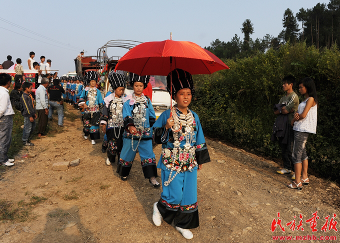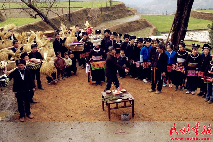 苗族送亲队伍来到新郎家的寨口,寨老为新娘主持“回喜神”仪式。杨昌垠,引自民族画报