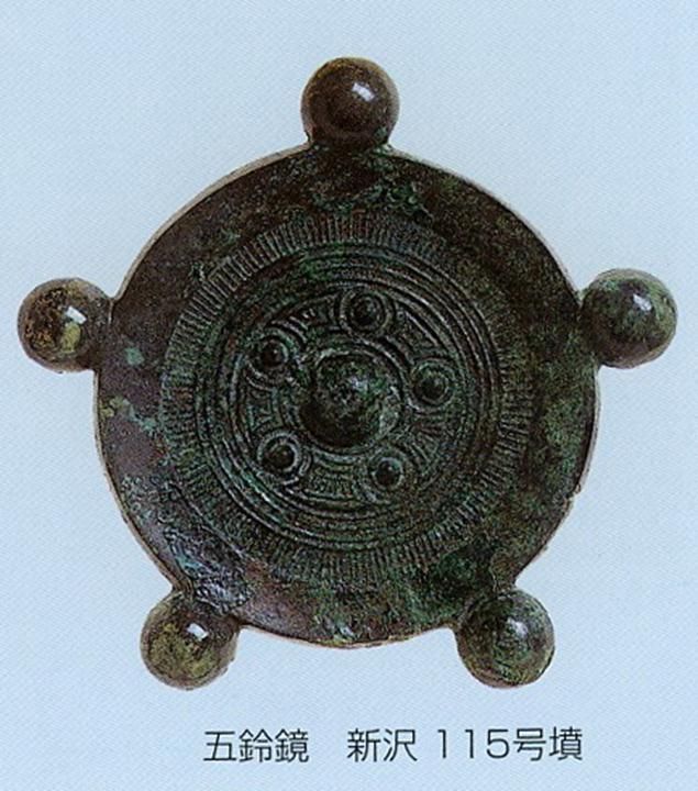 铜镜在古坟时代被视为珍贵而神奇的器物一方面从中国输入,另一方面也有就地制造。奈良县出土的大型仿制连弧纹镜和五铃镜(图十四),就是日本特有的铜镜类型。