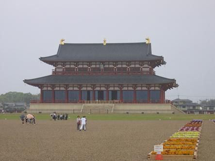 平城宫是天皇的居所和政府衙署之所在,面积约1.2平方米,从1956年开始,主要由(国立考古学研究所)奈良国立文化财研究所进行有计划的全面发掘。1963年,又由国家征收了宫城范围内的大部分土地,将其建成国家遗址公园。近半个世纪以来,奈良文化财研究所成年累月地不间断发掘,明确了宫城的布局,发掘出了以太极殿为首的一批重要遗址(图二十二),这些遗址均已得到妥善保护和复原。如今,平城宫迹已被列入世界文化遗产名录。